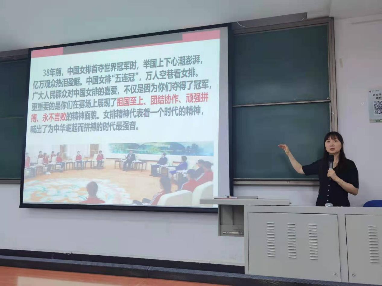 李慧副教授从女排精神的形成与发展、女排精神的内涵以及女排精神与文化自信的关系等几个方面为在场师生详细解读了女排精神的演进逻辑与重要价值。她通过大量史实与案例,用图文结合的方式将中国女排“祖国至上、团结协作、顽强拼搏、永不言败”的精神内涵展现给大家,让在场师生更加深入了解了“女排精神”的意义。女排精神继承了党的红色文化基因,也是中国共产党百年历程中形成的革命精神之一,与马克思主义政党的核心价值观高度契合。女排精神的发展与中国特色社会主义事业的发展历程同频共振,是改革开放以来国人精神风貌的缩影。作为时代的“最强音”,女排精神从形成之初就一直发挥着激发爱国热情,增强民族自尊心、自豪感和激励全国人民建设社会主义事业的精神支撑的作用。
